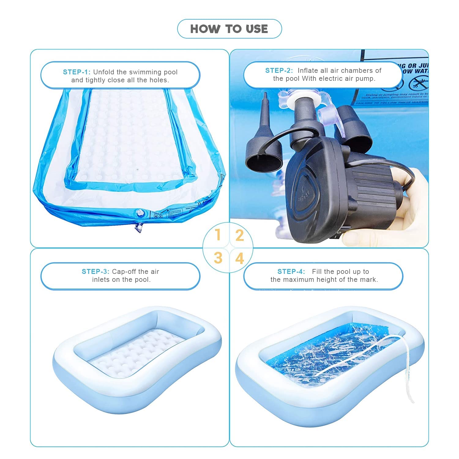 The pool comes with a high-efficiency double-action air pump for quick inflation and easy setup. It is lightweight, foldable, and easy to store, making it perfect for use on terraces, balconies, gardens, or backyards.
